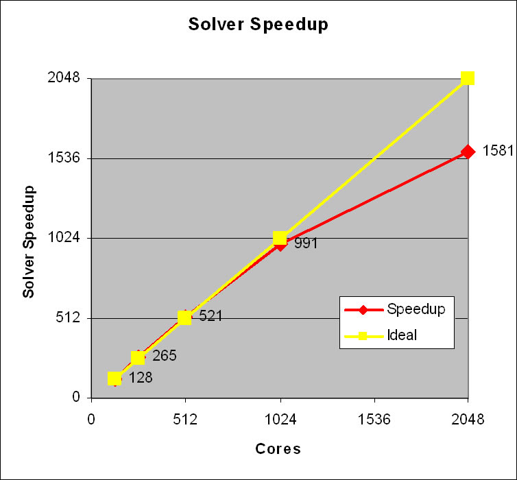 Auf den ersten Blick beeindruckend: der Solver skaliert bis zu einer Anzahl von fast 1.024 (!) Kernen annähernd linear. Für sich genommen eine respektable Leistung der Entwickler.