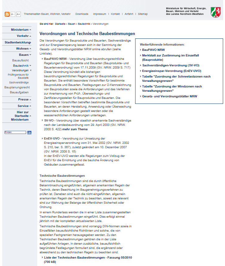 Gemäß Runderlass des Ministeriums für Wirtschaft, Energie, Bauen, Wohnen und Verkehr des Landes Nordrhein-Westfalen vom 22. Mai 2012 sind seit 1. Juli 2012 die im Dezember 2012 konsolidierten Fassungen der Eurocode-Reihe 1 bis 5 als Technische Baubestimmungen eingeführt. Auf der Internetpräsenz des Ministerium wird noch immer auf die Liste der Techn. Baubestimmungen mit Stand von Mai 2010 verwiesen. Wenigstens entspricht die diesem Link hinterlegte Liste dem aktuellen Stand.