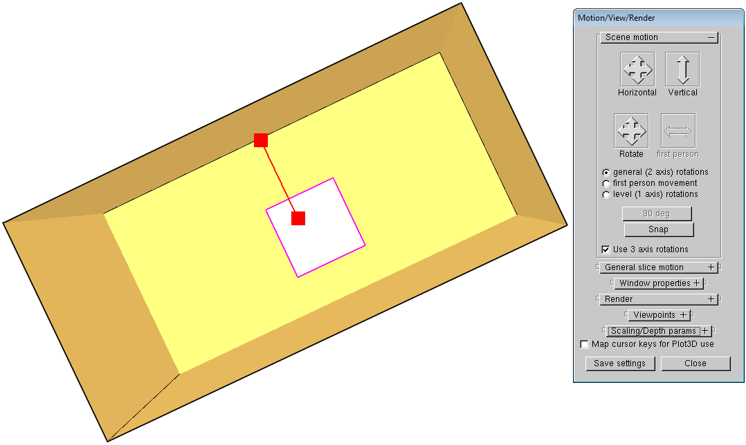 Die Auswahl der neuen Rotationsachse erfolgte bisher nicht über eine weitere Tastenkombination, sondern über einen Mausklick in den Randbereich des Fensters. Smokeview wird also also zukünftig das Fenster in verschiedene Bereiche aufteilen.